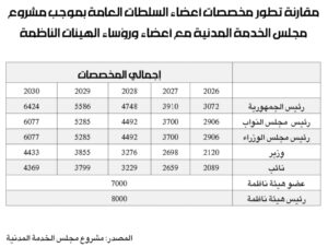يُذكر أنّ المبالغ التي يتقاضاها النائب تقسم إلى مخصّصات وتعويض التمثيل وتعويض سيارة وهاتف وتعويض سائق وأمين وتعويض تشريفات. وفي حال السير بمشروع مجلس الخدمة المدنية تصبح قيمتها الإفرادية في عام 2030 نحو 4369 دولاراً شهرياً.
