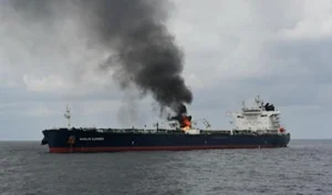 ناقلة النفط البريطانية «مارلين لواندا» أثناء اشتعالها في خليج عدن..