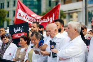 اعتصام لعدد من الأطباء من منظمة «أطباء بلا حدود» في بيروت لإيقاف حرب الإبادة في غزة..