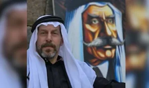 الأمير حسن الأطرش قرب لوحة لجده سلطان الأطرش قائد الثورة السورية عام 1925