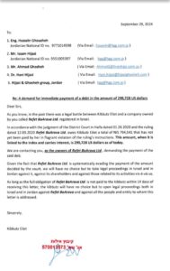 ومع رفع الكيبوتس الإسرائيلي قضيّة في الأردن، لمطالبة الشركة بالتعويض المالي، لم تجد الأخيرة بداً من إصدار بيان في الـ24 من أيلول الماضي، تحتجّ فيه بأن نشر الإنذارات الموجّهة إليها من الكيبوتس، في الإعلام، قد أَلحق الضرر بها. مع هذا، لم تنفِ «حجازي وغوشة» نشاطها التجاري في إسرائيل، علماً أنه مسموح قانونيّاً، وإنْ كان مرفوضاً اجتماعيّاً وشعبيّاً، باعتباره شكلاً من أشكال التطبيع. وتستند الشركة في رفضها الاستجابة إلى قرارات المحاكم الإسرائيلية والإنذارات العدلية الأردنية – طبقاً لمصادر ونشطاء أردنيين – إلى علاقاتها ونفوذها داخل أجهزة السلطة الأردنية الأمنية والسياسية.