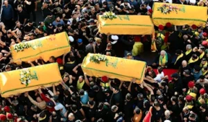 مئات اللبنانيّين يُشيِّعون خمسة شهداء لحزب الله، في النبطية، أمس!