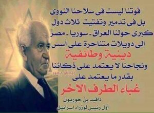 كان بن غوريون يرى أنّ إزالة الخطر على إستمرار بقاء الكيان الصهيوني وإمكانية تحقيق أهدافه الكبرى، مرتبط بنجاحه في تفكيك وتفتيت الدول العربية على أسُس دينية وطائفية، وإستطراداً تدمير ثلاثة جيوش (الجيش المصري والجيش العراقي والجيش السوري). وها نحن اليوم نرى ما حلّ بالدول العربية وما حلّ بالجيوش الثلاثة. و ما يجري قي السودان هو في إطار إستراتيجة التفكيك والتفتيت. ولن يتوقّف الوضع السواداني عند غرب دارفو بل سيمتد إلى المنطقة الشرقية للسودان، وبعدها سيمتد التفكيك والتفتيت و ولادة الكيانات الهجينة الى صحراء النوبة جنوب مصر و منها تكون بداية تفكيك مصر!