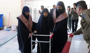 عجوز عراقية تتلقى مساعدة للوصول إلى صندوق الاقتراع في النجف للإدلاء بصوتها.