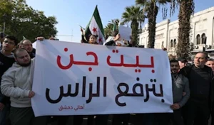 أعلاه | متظاهرون سوريون يرفعون لافتة تشيد بمقاتلي بيت جن، خلال تظاهرة جرت في دمشق!