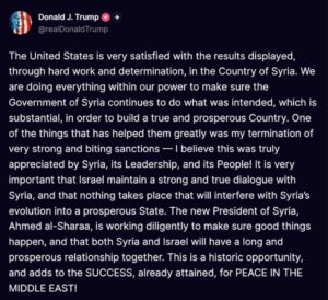 قال ترامب إنّ «من المهم جدّاً أن تحافظ إسرائيل على حوار قوي وصادق مع سوريا، وألّا يحدث أيّ شيء من شأنه أن يعرقل تطوّر سوريا نحو دولة مزدهرة».