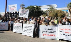 أعـلاه | يمنيّون يحتجّون خارج مطار صنعاء المتوقّف عن العمل بفعل العدوان الإسرائيلي عليه، للمطالبة بإعادة فتحه
