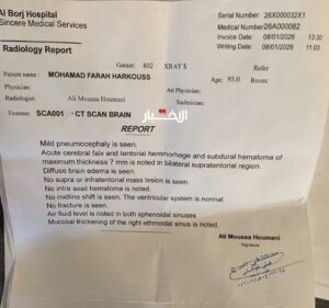 لاحقاً، أجري تصوير طبقي محوري للدماغ في مستشفى برج البراجنة، وأظهرت نتيجة التقرير، الذي اطلعت عليه «الأخبار»، وجود هواء خفيف داخل القحف، ونزف دماغي حاد في منجل الدماغ وخيمة الدماغ، إضافة إلى ورم دموي تحت الجافية، بسماكة قصوى بلغت 7 مم، فوق الخيمتين على الجانبين، مع تسجيل وذمة دماغية منتشرة.