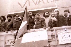 ياسر عرفات يرفع علم فلسطين بعد إنزال علم الاحتلال الإسرائيلي المؤقت من سارية سفارة الكيان.